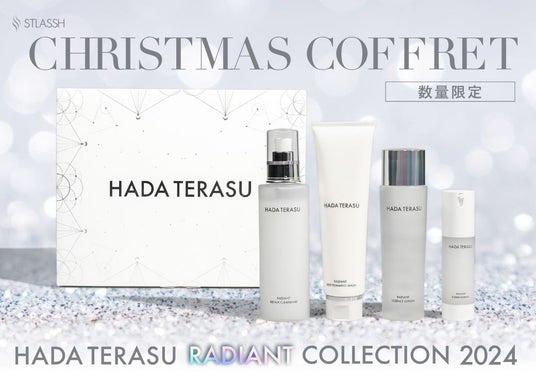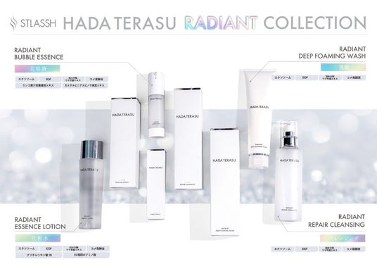 HADA TERASU(ハダテラス)から、新たに「RADIANT(ラディアント)」シリーズが誕生しました。 「RADIANT」には「光を放つ」「光り輝く」という意味が込められています。 このシリーズは、HADA TERASUをお使いいただくお客様が、より一層「光り輝く透輝肌」を叶えていただけるように願いを込めて開発されました。