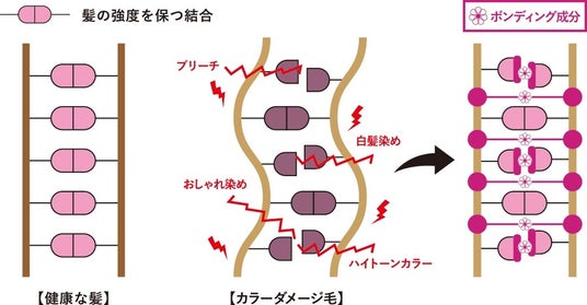 リ・ヘアカラーケアシリーズは、ボンディング成分で切れた結合にアプローチし、髪を芯から強くします。