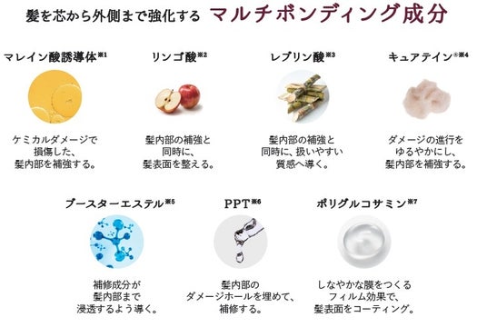 ※1 セスキマレイン酸イソホロンジアミン〈毛髪補修剤〉 ※2〈 pH調整剤〉 ※3〈 毛髪補修剤〉 ※4 加水分解ケラチン(羊毛)〈毛髪補修剤〉※5 シクロヘキサン-1,4-ジカルボン酸ビスエトキシジグリコール〈コンディショニング剤〉 ※6 アイテム別に選定し配合しています。加水分解ケラチン(羊毛)、加水分解ケラチン(カシミヤヤギ)、加水分解シルク、加水分解コメタンパク〈毛髪補修剤〉 ※7 キトサン(ラウラミド/サクシナミド)、キトサンステアラミドヒドロキシプロピルトリモニウムクロリド〈毛髪補修剤〉