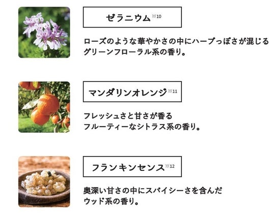 ※10 ニオイテンジクアオイ油 ※11 マンダリンオレンジ果皮油 ※12 ニュウコウジュ油