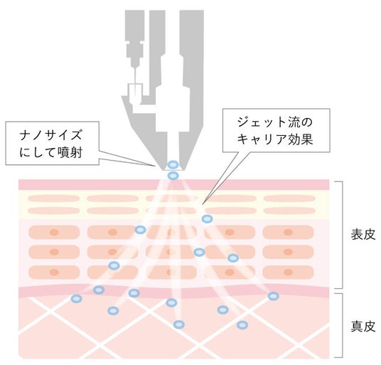 96%のヒト幹細胞培養液+1%のエクソソーム「BMS」を、時速1200kmの高圧エアージェットとナノ技術で、美容液をナノサイズの霧状にして噴射し、肌の深部皮膚層まで浸透させます。それによって有効成分の効果が発揮され、長期に渡り定着します。