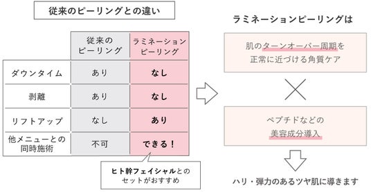 通常のピーリングは、酸を使用して汚れを落とすだけですが、ラミネーションピーリングは、低刺激な3種類の酸(AHA・PHA・LHA)を用いたピーリングでやわらかくなった肌にペプチドなどのハリ・弾力を与える成分を塗布します。施術中のリフトアップマッサージも大きな特徴で、肌の内側から輝くような仕上がりが期待できます。
