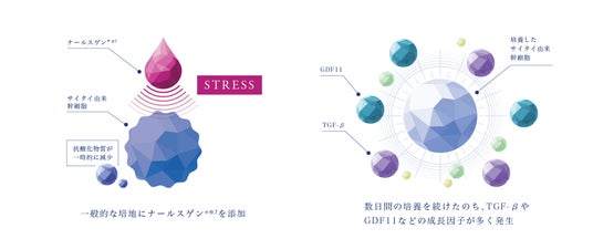 今、注目の「サイタイ幹細胞」に、エイジングケア※1に特化した成分として話題の「ナールスゲン(R) ※7」を組み合わせるという新たな発想で培養を行いました。すると幹細胞に適度なストレスがかかり、その結果さまざまな物質が増加します。とくに、美しさのカギとなる因子が約1.3倍にも増加することがわかりました。