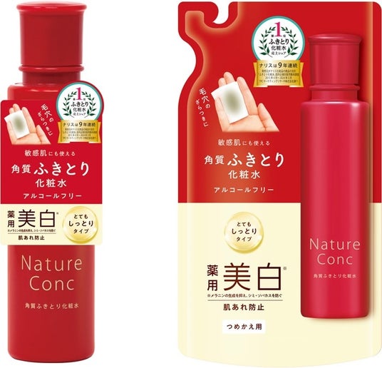 当社の調査では、一般的にふきとり化粧水は、老化角質を取り除くケアであるため、刺激が強いというイメージを持っている人が多く存在します。「ネイチャーコンク」は、90年近く続く角層研究をもとにハトムギや月見草など植物由来の保湿成分のチカラで毎朝晩気持ちよくケアできることが健やかな肌に導く秘訣です。今回新しく敏感肌の人の協力によるパッチテストを実施しクリアしています。美白※3・ニキビ予防・肌あれ防止に加えて、毛穴のざらつきケアまでできる「ネイチャーコンク」。実は朝の洗顔代わりにも使用することができ、使用者や使用シーンに広がりが生まれています。今回のリニューアルは医薬部外品をイメージしやすいパッケージに刷新。敏感肌の人も含めてより多くの人の肌悩みにこたえるブランドに育てていきたいと考えます。 ※3 メラニンの生成を抑え、シミ・そばかすを防ぐ。