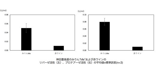 また、リパーゼ、プロテアーゼについても赤ワインよりも活性が高いことが確認されました。つまり、「Me」は効率的に酵素を摂取できるみりんであることが証明されました。