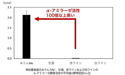 神田豊島屋のみりん「Me」の酵素活性(αアミラーゼ)は工場生産の国内大手メーカーA社、B社の甘酒、赤ワインおよび白ワインよりも100 倍以上高い