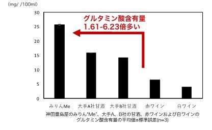 神田豊島屋のみりん「Me」の旨味成分は工場生産の国内大手メーカーA社、B社の甘酒、赤ワインおよび白ワインよりも1.61-6.23倍多い