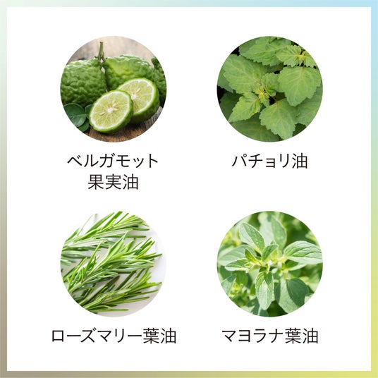 *3 オリジナルアロマブレンド:ベルガモット果実油、パチョリ油、ローズマリー葉油、マヨラナ葉油