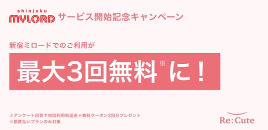 新宿エリアで初となるReCuteの設置を記念して、新宿ミロードでの利用に限り、2回まで利用料が無料になるキャンペーンを実施いたします。初回利用料返金キャンペーンと併せてご利用いただくことで、最大3回まで利用料が無料になります。