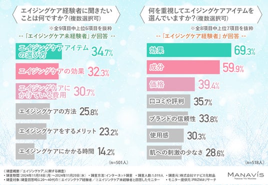 そこで今回、「マナビス エイジングケアクリーム」を展開する株式会社マナビス化粧品は、20~40代の1.エイジングケア経験者/2.エイジングケア未経験者を対象に、「エイジングケア」に関する調査を実施しました。
