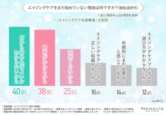 エイジングケア未経験者に「エイジングケアをまだ始めていない理由は何ですか?(複数選択可)」と質問したところ、『何から始めればよいかわからないから(40.9%)』が最も多く、『費用がかかるから(38.9%)』『面倒くさいから(25.6%)』と続きました。
