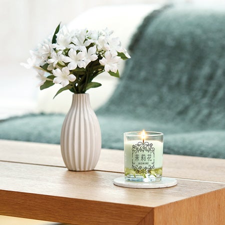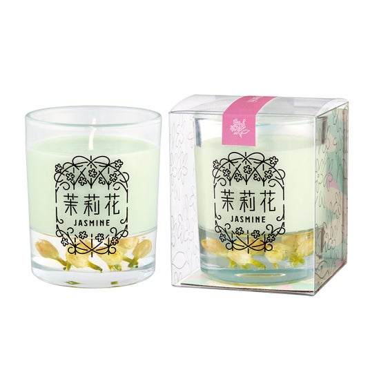ジャスミンのドライフラワーを閉じ込めたボタニカルキャンドル。