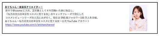 さらに、美容系クリエイター「ありちゃん」が本施設内でお買い物を楽しむ動画「渋谷スクランブルスクエアで爆買い企画」を公開。「ありちゃん」セレクトによる幅広いコスメを紹介する動画をお楽しみいただけます。
