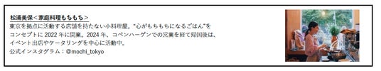 デンマーク帰りのフードクリエイター「家庭料理もちもち」の松浦美保氏が作る、家庭的なおばんざいをベースにした数量限定のミニおせちや出来立てのだし巻きたまごをご用意。数量限定のミニおせちをご注文のお客さまには、振る舞い酒をプレゼントします。渋谷のまちを見下ろせる会場で、美味しい料理とドリンクで新年からHAPPYを感じてください。