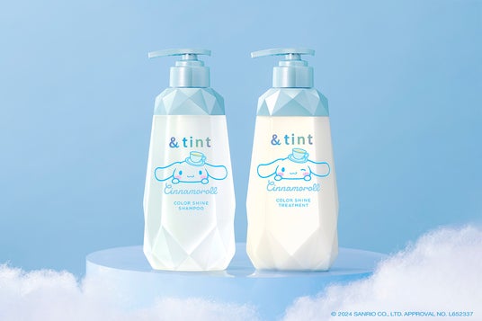 &tint(アンドティント)はヘアカラーの退色抑制と髪の光沢度に着目し、 韓国美容サロン「LAMAISON」とのコラボ開発により誕生しました。 今回は、シナモロール 限定デザインの水色×白のパッケージで登場。 カフェ・シナモンのジャスミンティーの香りで毎日のバスタイムを華やかに彩ります。