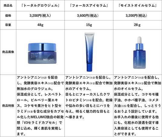 株式会社わかさ生活(本社:京都府下京区)は、北欧のフィンランド語で「me(=私に)lumo(=魔法)」をかけるという想いを込めたスキンケアブランド「MELUMO」より、3つの新商品『トータルグロウジェル』『フォーカスアイセラム』『モイストオイルセラム』を2024年12月16日から2025年1月13日までの期間に応援購入サービス「Makuake」にて先行販売を実施します。