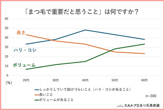 20代から60代の女性300人に「まつ毛で重要にしていること」を調査したところ、20代では43.3%が「長いこと」が最も重要であると回答しました。一方で「長さ」は、30代では36.7%、40代では33.3%…と、年齢を重ねるにつれて需要が下がることが明らかになりました。
