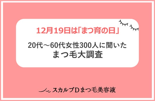 12月19日は「まつ育の日」です。「スカルプDまつ毛美容液」が、年末12月の「まつ」と19日「いく」の語呂合わせと、1年間、毎日のメイクなどさまざまな負担を乗り越えてきたまつ毛をしっかり労わってあげる日にと、この日付に制定いたしました。「まつ毛を労わる日」ということから、全国の20代~60代女性300名を対象に実施した、まつ毛に関する調査結果を発表いたします。