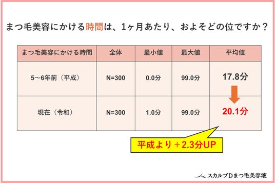 また、5~6年前と現在の「1か月間あたりにまつ毛美容にかける時間」を調査したところ、5~6年前は平均17.8分、現在は平均20.1分という結果に。平成から令和にかけて、平均2.3分増加していることが分かりました。