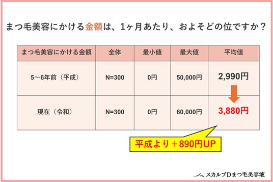 今回の調査から、平成から令和にかけて「1か月間あたりにまつ毛美容にかけるお金」は平均890円増加しており、