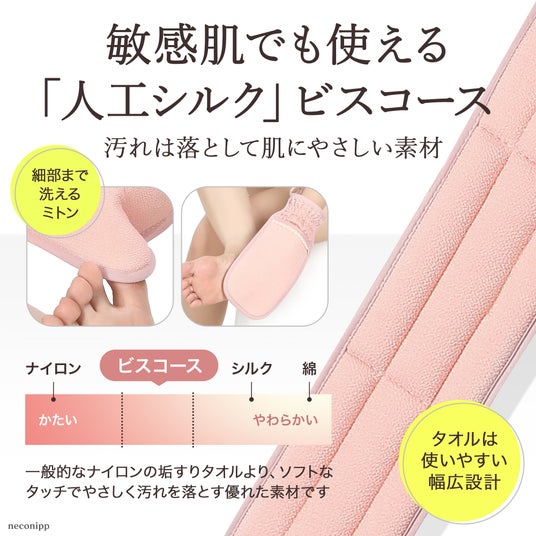 当社の垢すりタオルとミトンには、敏感肌の方でも安心して使っていただけるよう「人工シルク」ビスコースを使用しています。