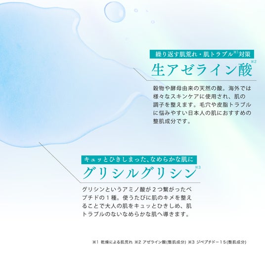 生アゼライン酸*3とグリシルグリシン*4を組み合わせ、肌荒れや皮脂*5、凹凸感にアプローチし、 なめらかな肌へ導きます。そのほか整肌成分であるナイアシンアミド、パンテノール、サリチル酸(BHA)、CICA(ツボクサ葉エキス)などのサポート成分も配合しています。