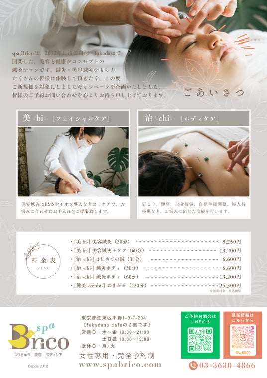 2025年2月末日までの間、spa Bricoをご利用経験がない方を対象に、お得に鍼灸、美容鍼灸をご体験いただけるキャンペーンを実施いたします。