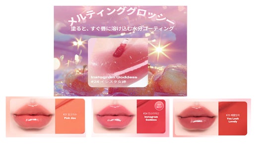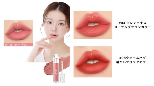 最大の特徴:唇に触れた瞬間広がるウォーターティントの潤い感とベルベットの柔らかさ、水を含んだように輝く光彩カラー、綺麗でグロッシーなデイリーカラーを演出
