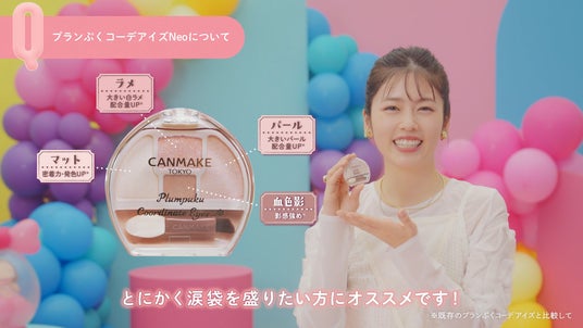 CMは小芝さんの「涙袋に」の声を合図に、女性たちが「プランぷく!」と声をそろえる場面から元気にスタート!3つのカラーとこだわり影色の涙袋アイシャドウパレット「プランぷくコーデアイズ」を歌ったポップなオリジナル曲に合わせて展開していきます。「パールでぷく♪」「マットでぷく♪」「ラメでぷく♪」と、「プランぷくコーデアイズ」の3つの質感が異なるパウダーでそれぞれに可愛い涙袋に仕上げる女性たち。そして小芝さんもなめらかチップでパウダーをのせ、ぷっくり涙袋が完成!思い思いの涙袋を叶えた女性たちの笑顔はじける賑やかなシーンが続き、ラストは小芝さんと女性たちが声をそろえて「笑う顔にはぷくきたる!」のメッセージで締めくくります。