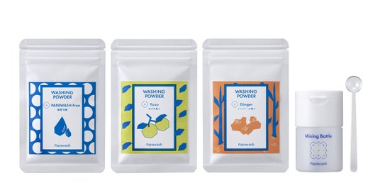 左から、パパウォッシュフリー20g(無香料)、ウォッシングパウダー(ゆずの香り)20g、ウォッシングパウダー(ジンジャーの香り)20g(朝晩500円硬貨大0.5gで約20日分)合計60gで約2ヶ月分、DIY酵素洗顔用ミキシングボトル(40g容量)、計量スプーン(山盛り1杯1g)