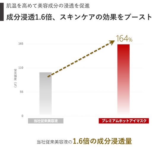目まわりに貼り付けるとすぐに美容液が肌の水分に反応し発熱、目元の皮膚温度が最大で1.1度上昇。60分間効果が持続するため、洗顔後の肌を温めてほぐし、美容成分の浸透*¹を高めます。