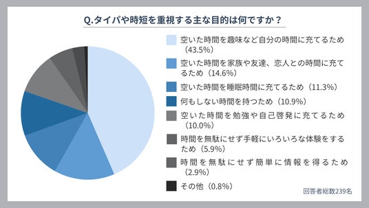 今回の調査で時短やタイパを重視する目的を尋ねたところ、もっとも多かった回答は「空いた時間を趣味など自分の時間に充てるため」(43.5%)でした。
