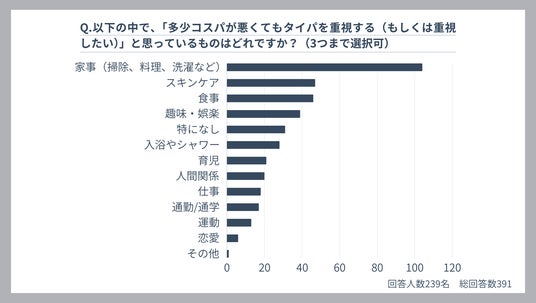 – コスパよりタイパを重視する場面では、「家事」が 104票 で最も多く、次いで「スキンケア(47票)」や「食事(46票)」が挙げられた。