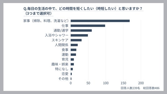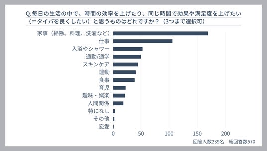– 「タイパを向上させたい日常の行動」として挙げられたのは、家事(169票)がトップで、次に仕事(106票)、入浴やシャワー(53票)。