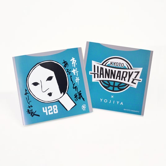 鮮やかなブルーが目立つ京都ハンナリーズのユニフォームをイメージしたデザインのあぶらとり紙。表面にはチームロゴ、裏面には「よじこ」とよじこの背番号「428」が入っています。