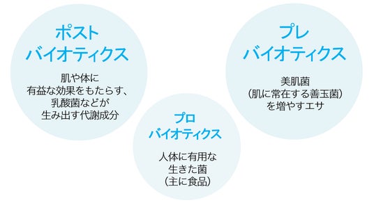 現在マイクロバイオーム研究には、主に3つのアプローチがあります。とくに2021年に定義(※4)された「ポストバイオティクス」は、乳酸菌などの善玉菌がエサを食べることで代謝する人体に有用な成分に着目し活用する研究。免疫力の活性化はもちろん肌のバリア機能アップなどの高い美肌効果が期待されています。