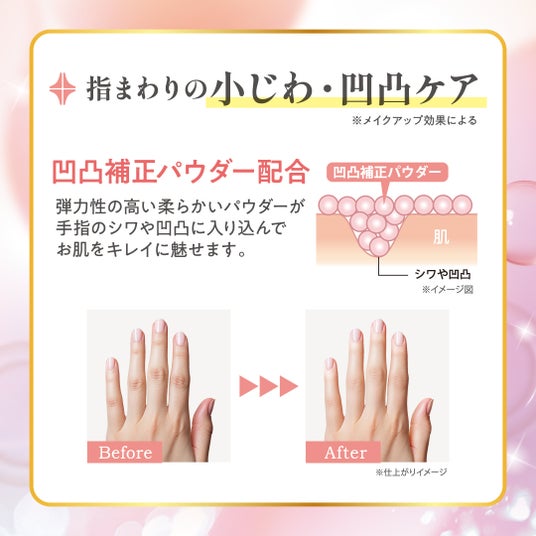 凹凸補正パウダーを配合弾力性が高く柔らかい凹凸補正パウダーが、手指の小じわや凹凸に入り込んで指まわりをキレイに魅せます。シワや乾燥が気になる手指のケアにおすすめです。