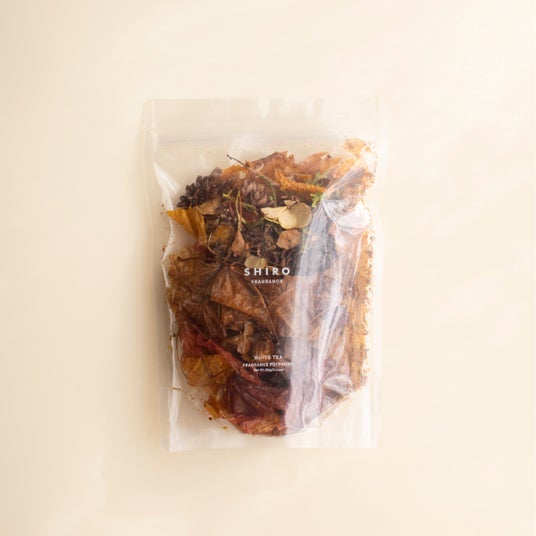 北海道の森林で見つけた落ち葉や小花、木の実などを乾燥させ、爽やかで落ち着きあるホワイトティーの香りをまとわせました。余分な手は加えず、自然が生み出した素材の魅力を、そのまま活かしたポプリです。こっくりとした赤や黄色のグラデーションを楽しみながら、やさしく深みある香りで、心安らぐひとときをお過ごしください。
