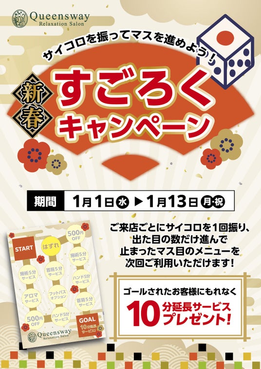 ご来店ごとにサイコロを振っていただき、出た目のマス目のメニューを次回ご利用いただけるイベントです。ゴールされた方全員に10分施術延長サービスをプレゼント!