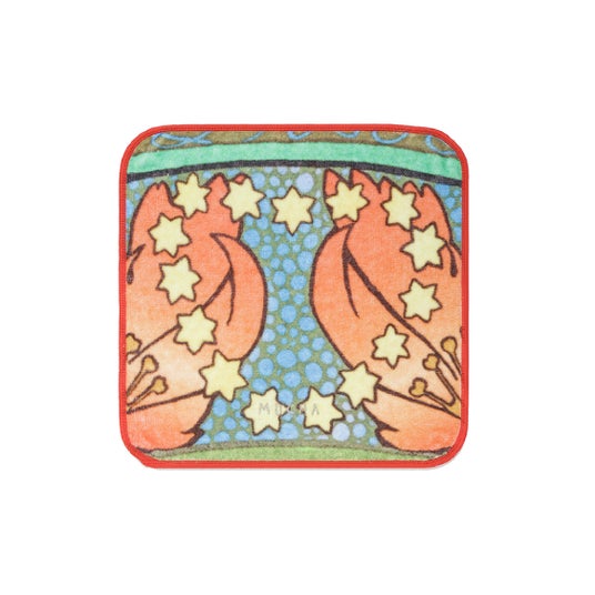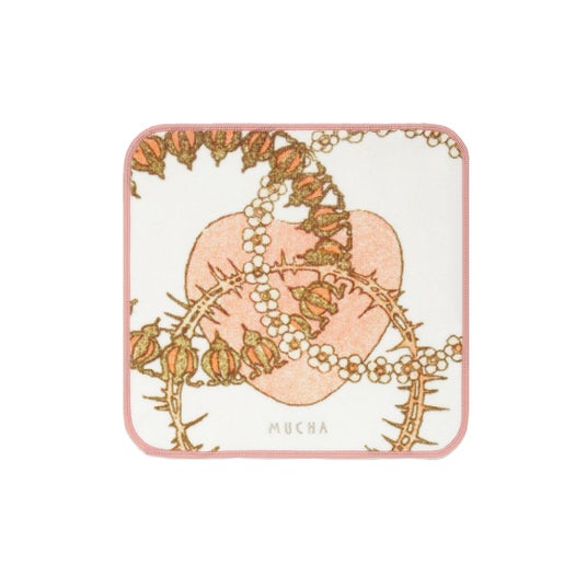 アート全体ではなくハートにスポットをあてた、彩り豊かな配色のハンドタオル。ミュシャの描いた印象的なハートを大胆にトリミングしたデザインに金糸の刺繍ロゴをさりげなくあしらいました。