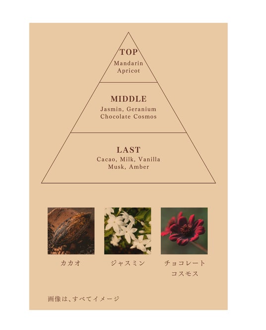 あまくとろけるようなリッチなカカオの香り。香りの一部に天然精油をブレンド。ふんわり広がるフローラルとミルクのあたたかみのある甘さでほろ苦いカカオのリッチな香りを引き立てています。