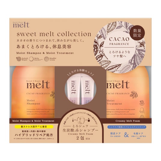 ※『メルト モイストシャンプー カカオフレグランス』『メルト モイストトリートメント カカオフレグランス』各480mlと『メルト クリーミーメルトフォーム』1.0g×2包のセット品です。セット品のみの販売となり、シャンプー・トリートメントそれぞれ単品で購入することはできません