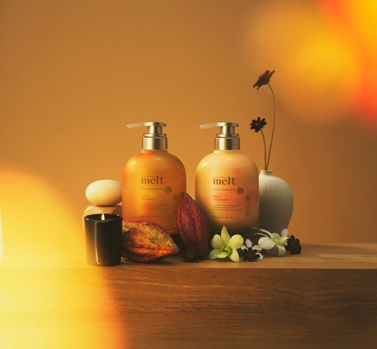 今回「melt」初めてのフレグランスシリーズ第一弾を発売。リッチなカカオの香りで気分をゆるめ、ちょっと贅沢な時間を過ごすように。“あまくとろけるバスタイム”をコンセプトに、大人っぽく上質なカカオの香りを表現しました。髪表面と内側を同時に補修するハイブリッドリペア処方で瑞々しくもやわらかくとろけるようなツヤ髪へと導く『メルト モイストシャンプー』『メルト モイストトリートメント』、ヘッドスパ発想のとろシュワ濃密泡ができあがる生炭酸*2 シャンプーの『メルト クリーミーメルトフォーム』(2包)の限定セットを発売します。