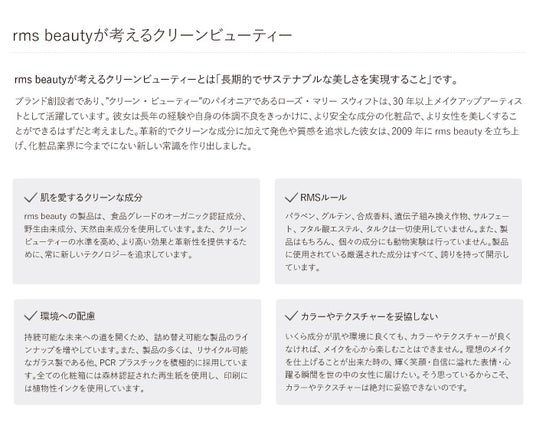 「クリーンビューティー」が新しい常識になるとは誰も信じていなかった約10年前。創設者であるローズ・マリー スウィフトはメイクアップアーティストとして長年活躍しながら、化粧品が原因で引き起こされた自身の体調不良をきっかけに、安全な成分で作られた化粧品で人々をより美しくしたいという強い決意を持ってクリーンビューティーブランド「rms beauty」を立ち上げました。革新的でクリーンな成分、かつ発色や質感を追求し、プロダクトを生み出してきました。