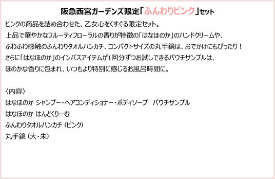 目もと用美容液や人気香りシリーズのシャンプーなどのパウチサンプル、寒い季節にぴったりの入浴料(現品)が入った、お得なセットとなっています。