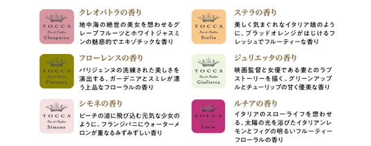 トッカならではの既成概念にとらわれない自由な発想は、「女性が美しくあるために」という共通項のもと、フレグランス・スキンケア・ランドリーといった既存のカテゴリーを超えた魅力的な製品たちを誕生させました。