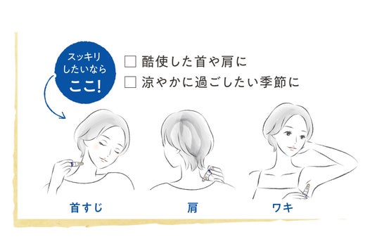 こめかみや首・肩まわりに直接コロコロと塗布してください。リフレッシュしたい時など、一日に何度でも使えます。
