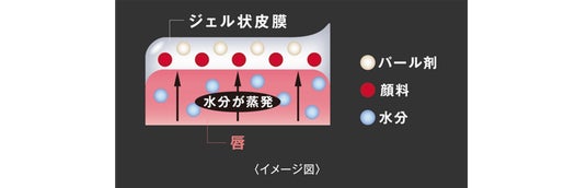 唇から蒸発する水分を活用して密着ジェル膜に変化する独自技術*により、つけたての色が長時間持続。唇の乾燥も防ぎます。