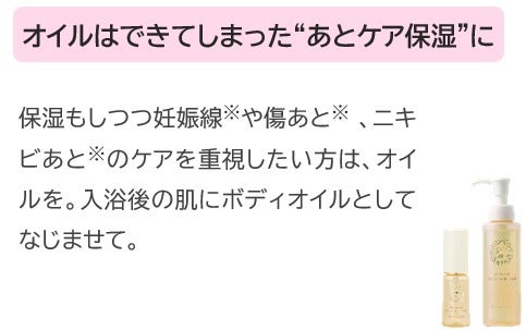 ゴワつき乾燥肌や妊娠中のボティケアだけでなく、妊娠線※や帝王切開の傷あと※ 、ニキビあと※などを保湿ケアする低刺激ボディオイル。