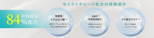 84%も配合した美容成分(※2)が肌内部に浸透(※3)して保湿するだけでなく、肌内側の水分も抱え込んで保水してくれるモイストチャージ処方を採用。しっかり保湿はされるのに油剤が肌に残らない設計のため、洗い流した後はまるで化粧水塗布後の肌のようにみずみずしく潤います。毎日のクレンジングで肌の土台からうるおい環境を整え、乾燥しにくい肌へと導きます。